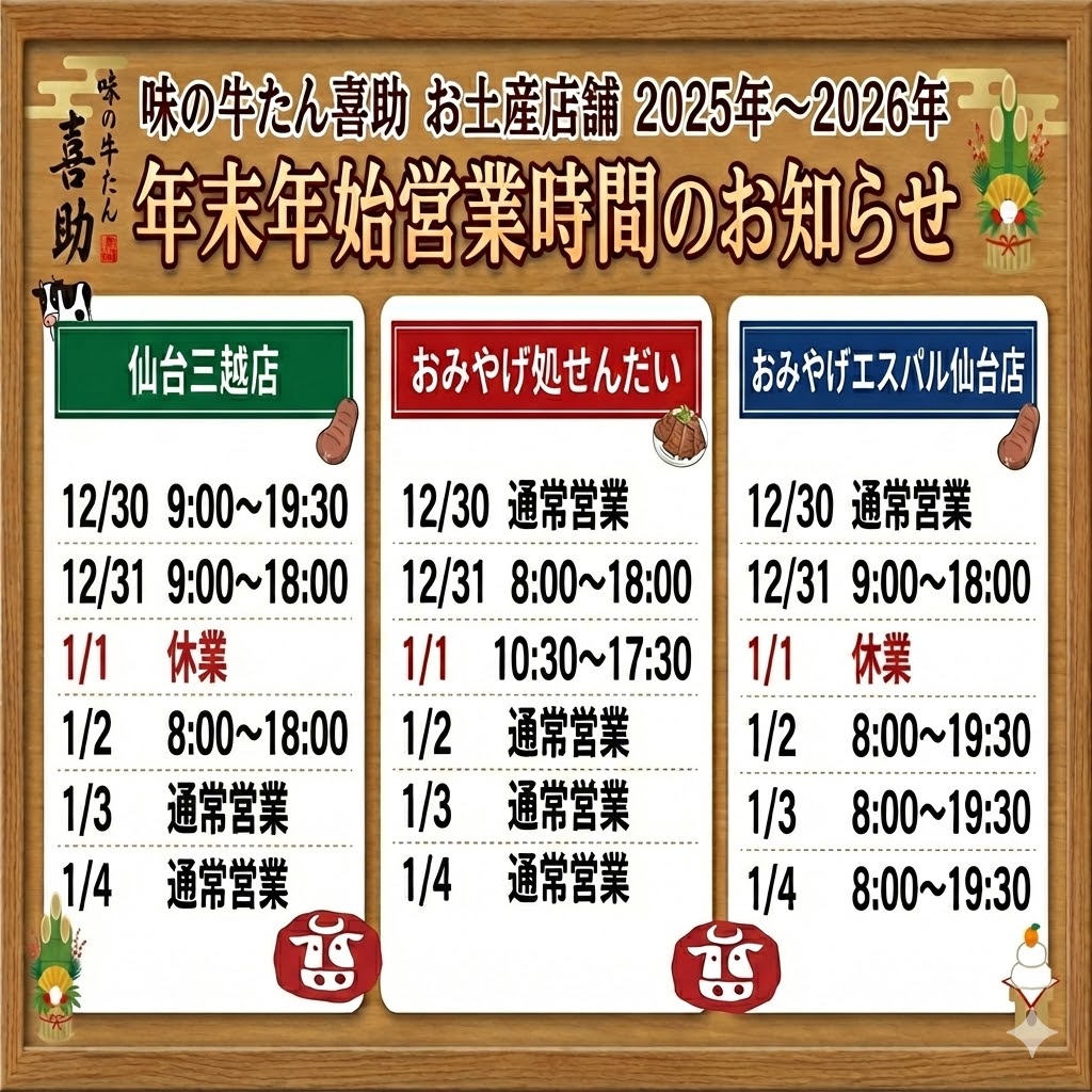 味の牛たん喜助グループ2025-2026年末年始の営業時間をお知らせいたします。